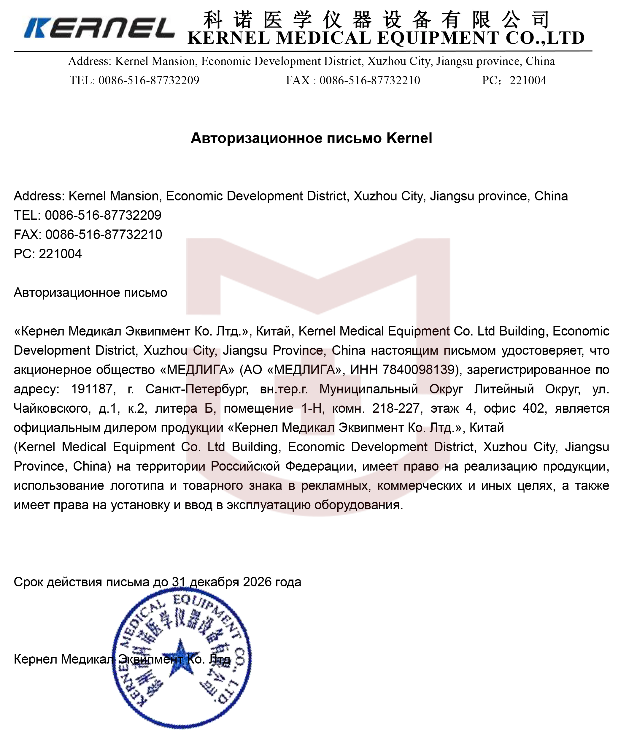 Авторизационное письмо Kernel от 2026 года