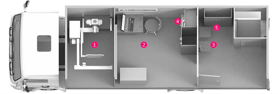 Кабинет рентгеновский перевозимый ПУЛЬМОЭКСПРЕСС для цифровой рентгенографии органов грудной клетки. В комплексе расположен низкодозный флюорограф ПУЛЬМОСКАН