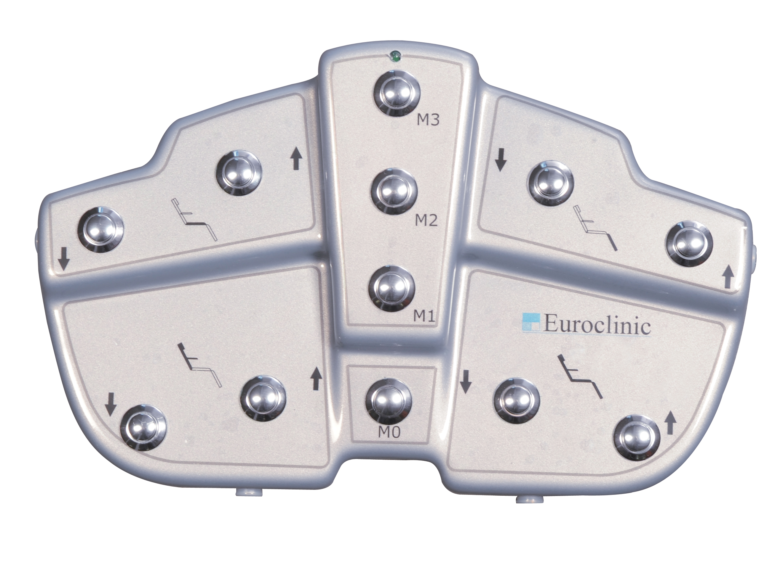 - Управление с помощью беспроводной педали с функцией памяти — врач может самостоятельно внести ту конфигурацию, которую хочет запомнить, и использовать единственное нажатие кнопки для перевода кресла в это положение. Запоминается до трех позиций, кнопки выделены в центральной части педальной панели. Четвертая кнопка выводит кресло в позицию «покой»;