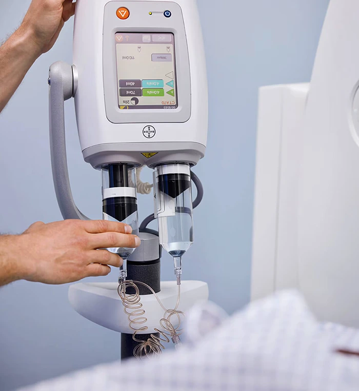 Использование солевого раствора для промывания создает плотный контрастный болюс, который позволяет точно рассчитать время введения контрастного вещества в сосудистую систему, что важно для многосрезового КТ-сканирования.