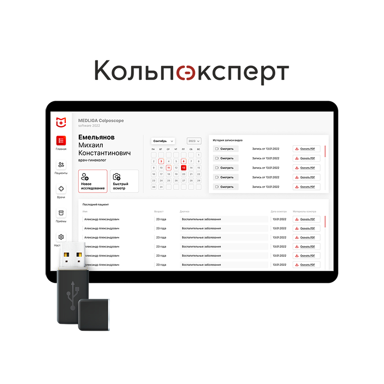 Интеграция с ПО «Кольпоэксперт» даёт возможность вести реестр осмотров, протоколы, фото и видеодокументацию, а также просматривать динамику состояний в рамках диспансерного наблюдения. Сбор анамнеза до кольпоскопии по стандартам ASCCP. Заключение по классификации Рио-де-Жанейро. Интеграция с медицинскими информационными системами (МИС).