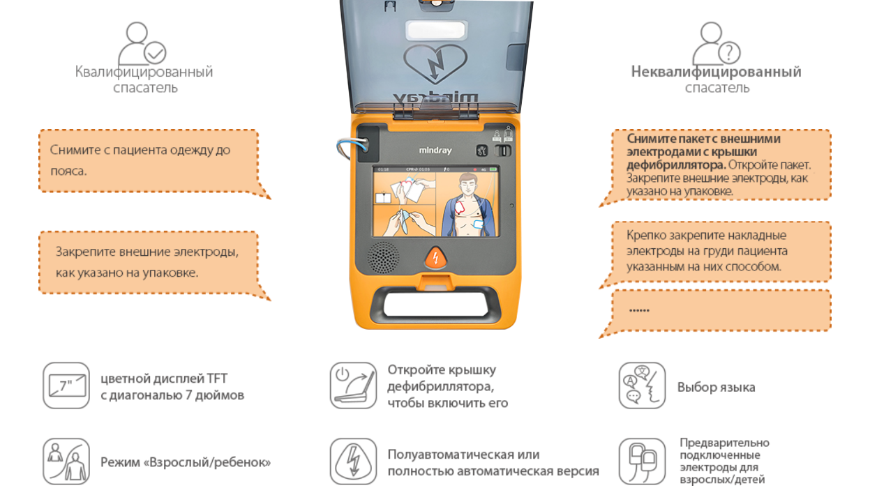 - Голосовые подсказки по проведению реанимационных действий на русском языке;