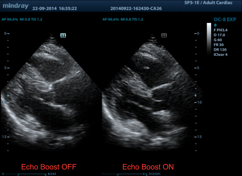 Режим Advanced EchoBoost применяется для улучшения визуализации при кардиологических исследованиях. Режим влияет на качество визуализации границ и структур сердца в серошкальном режиме. При активации модуля EchoBoost значительно повышается контрастное разрешение изображения и применяется особый адаптивный алгоритм шумоподавления. Режим оказывает качественное положительное влияние на визуализацию секторного фазированного датчика при исследованиях на сердце. Функционирование режима строится на последовательном применении трех модулей: