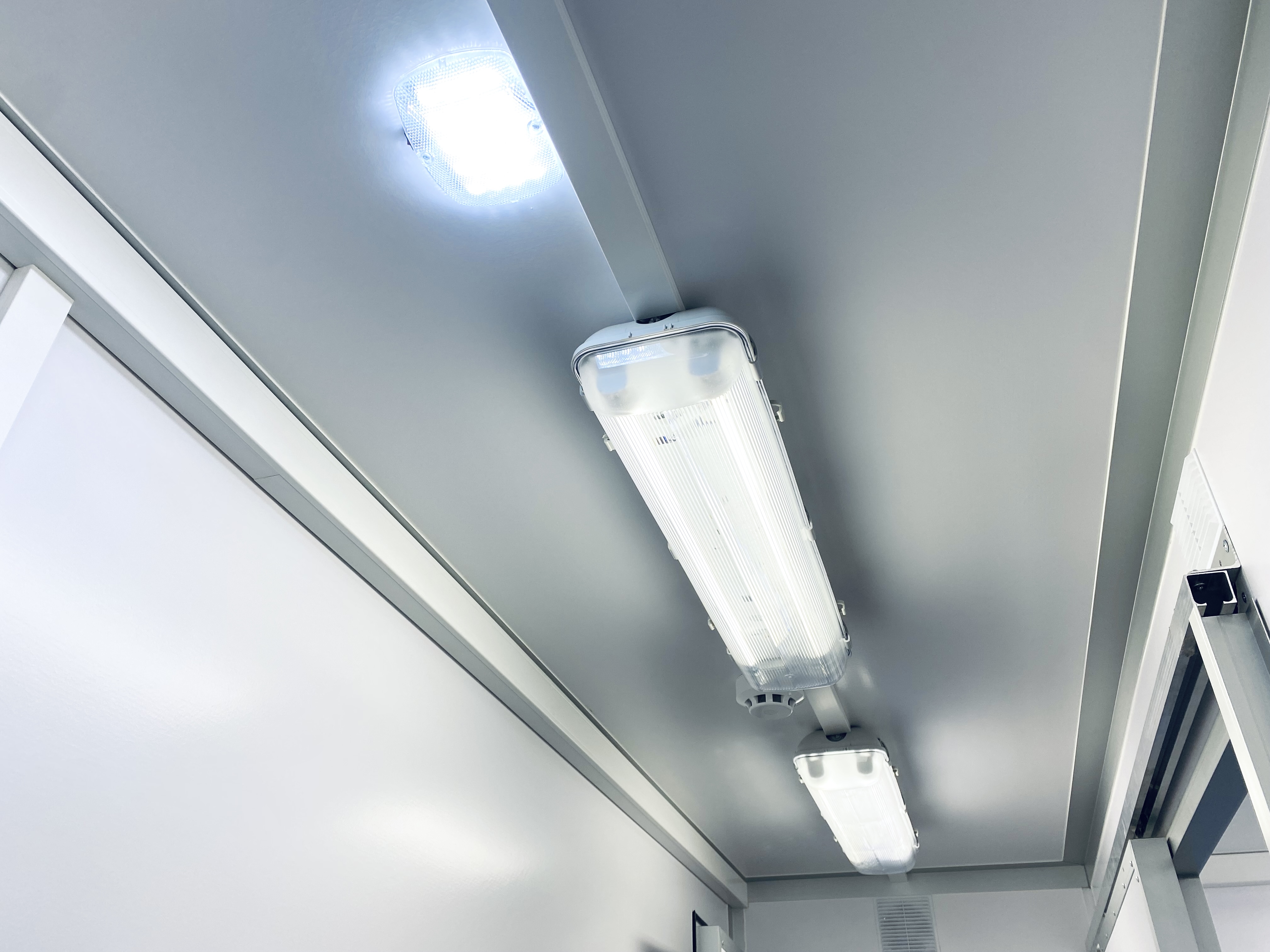 - Основное (220 В ) обеспечивается светодиодными светильниками, установленными на потолке в каждом отсеке.