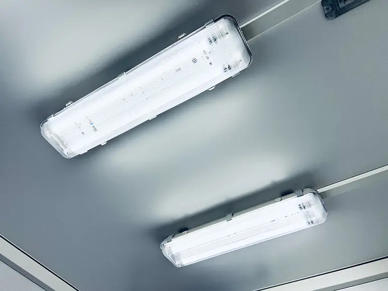 - Основное (220 В ) обеспечивается светодиодными светильниками, установленными на потолке в каждом отсеке.