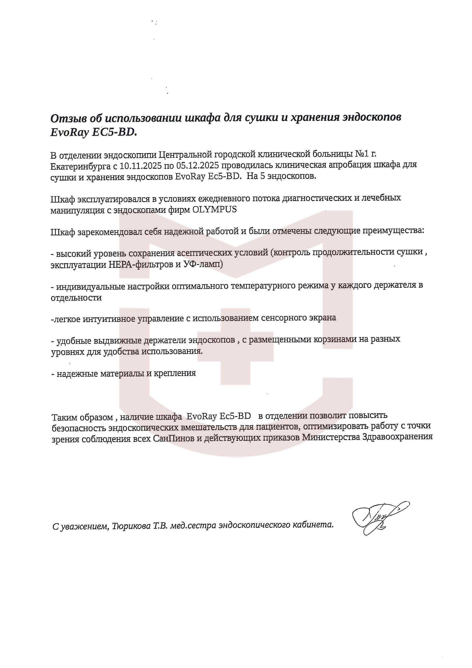 EVORAY EC-5BD представляет собой передовое решение, разработанное для обеспечения максимальной безопасности, эффективности и удобства в вашей эндоскопической практике. Универсальные держатели надежно фиксируют эндоскопы, а интуитивно понятный сенсорный дисплей обеспечивает полный контроль за циклами обработки. Прочный корпус из нержавеющей стали гарантирует долговечность и гигиеничность, а усовершенствованная система сигнализации своевременно предупреждает о любых отклонениях. Безопасность хранения обеспечивается запирающимися отсеками, а встроенный термопринтер позволяет мгновенно распечатать отчет о работе по каждому каналу, гарантируя полный контроль и отслеживаемость процессов