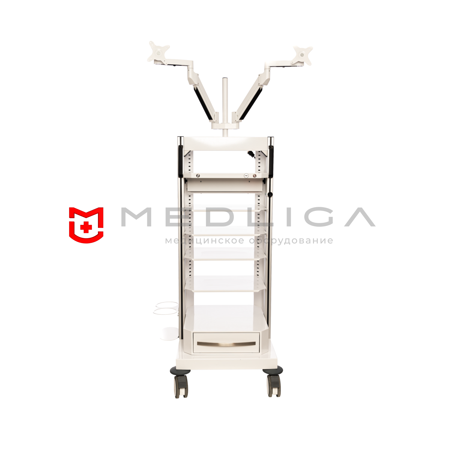 Стойка предназначена для размещения медицинского оборудования в лечебно-профилактических учреждениях, содержит 6 полок и ящик. Стойка оснащена держателем монитора, держателем камеры жесткого эндоскопа, держателем для двух аспирационных емкостей, блоком розеток, источником бесперебойного питания, устройством видеозахвата для записи видеосигнала на внешний носитель типа USB 2.0