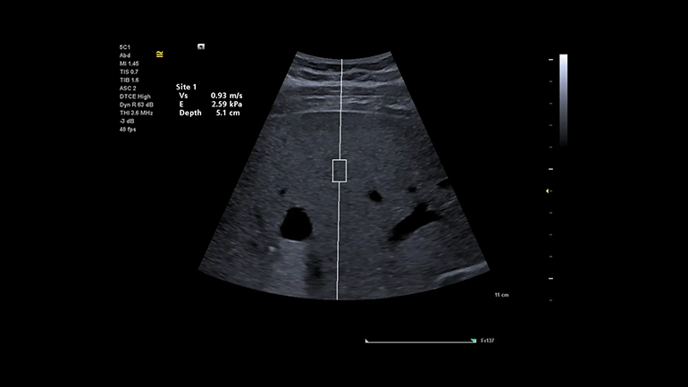 Технология оценки скорости распространения поперечной волны и эластичности в выбранной области интереса (Virtual Touch quantification). Метод измерения скорости поперечных (сдвиговых волн) в режиме реального времени, в котором используются низкочастотные акустические импульсы (ARFI), генерируемые непосредственно ультразвуковым датчиком. Оценка скоростей сдвиговых волн в выбранной врачом зоне интереса коррелирует с показателями жесткости ткани.