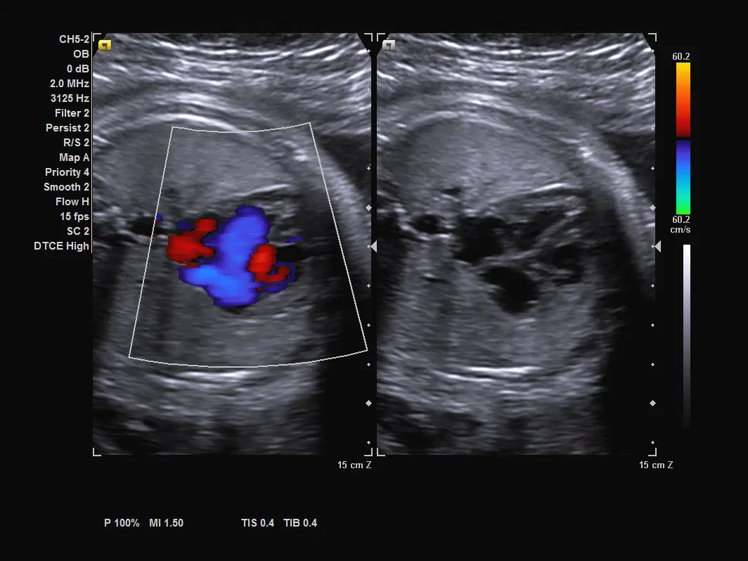 Визуализация сердца плода в режиме цветового доплеровского картирования с помощью датчика CH5-2