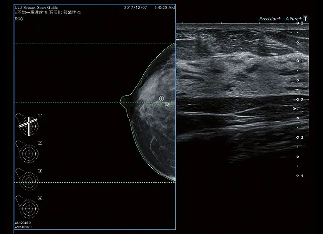 Руководство по сканированию молочной железы Aplio позволяет комбинировать ультразвуковое изображение в режиме реального времени с предварительно полученными данными маммографии для улучшения локализации поражений в интересующей пользователя области.