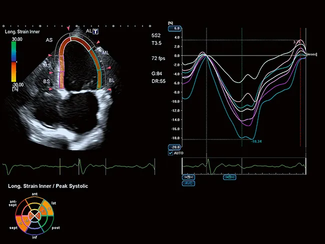 Усовершенствованная технология отслеживания движения сердечной стенки Aplio обеспечивает немедленный визуальный и количественный доступ к глобальной и региональной статистике движения стенки миокарда.