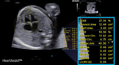 HeartAssistTM HeartAssistTM, основываясь на больших данных, полуавтоматически классифицирует ультразвуковое изображение по видам измерений, необходимым для диагностики сердца плода, и предоставляет результаты измерений и график распределения.