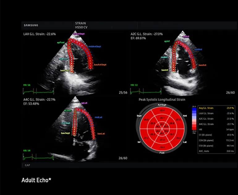 Strain+ - это количественный инструмент для измерения общего и сегментарного движения стенки левого желудочка (ЛЖ). Все, что нужно сделать пользователю, это нарисовать три точки, а затем Strain + автоматически очертит общую и сегментарную стенки и рассчитает данные о деформации. В Strain + три стандартных вида левого желудочка и "Яблочко" отображаются на четырехэкранном экране для простой и быстрой оценки функции левого желудочка. Samsung Strain+ повышает эффективность диагностики благодаря простому пользовательскому интерфейсу, интуитивно понятной визуализации и полезным руководствам по процедурам.