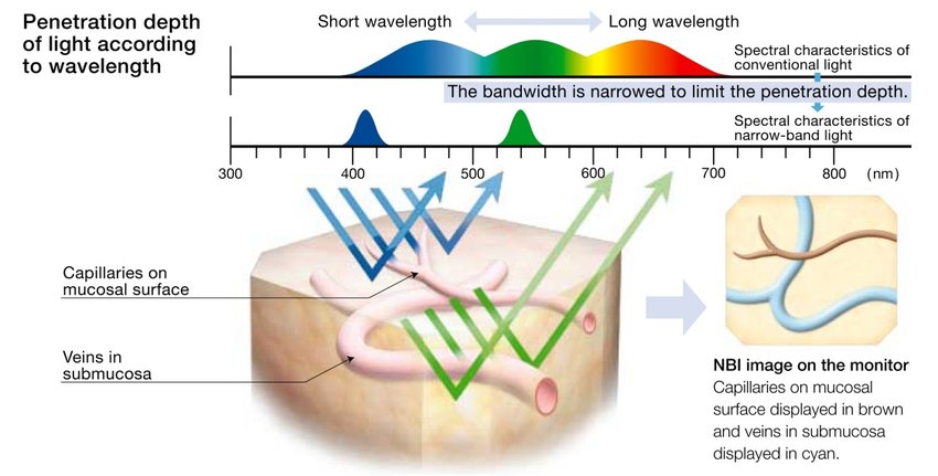 - Поддерживает технологию узкоспектральной визуализации Narrow Band Imaging (NBI) для увеличения видимости капилляров и прочих структур на поверхности слизистой. Данный метод исследования снижает необходимость в инвазивных манипуляциях, в том числе биопсии.